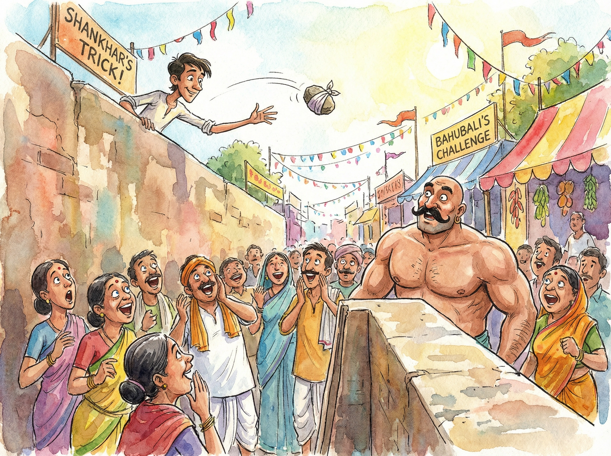"Agreed," said Shankhar. "But I have two conditions. First, bring me a very long, strong rope. Second, everyone must cheer for me."