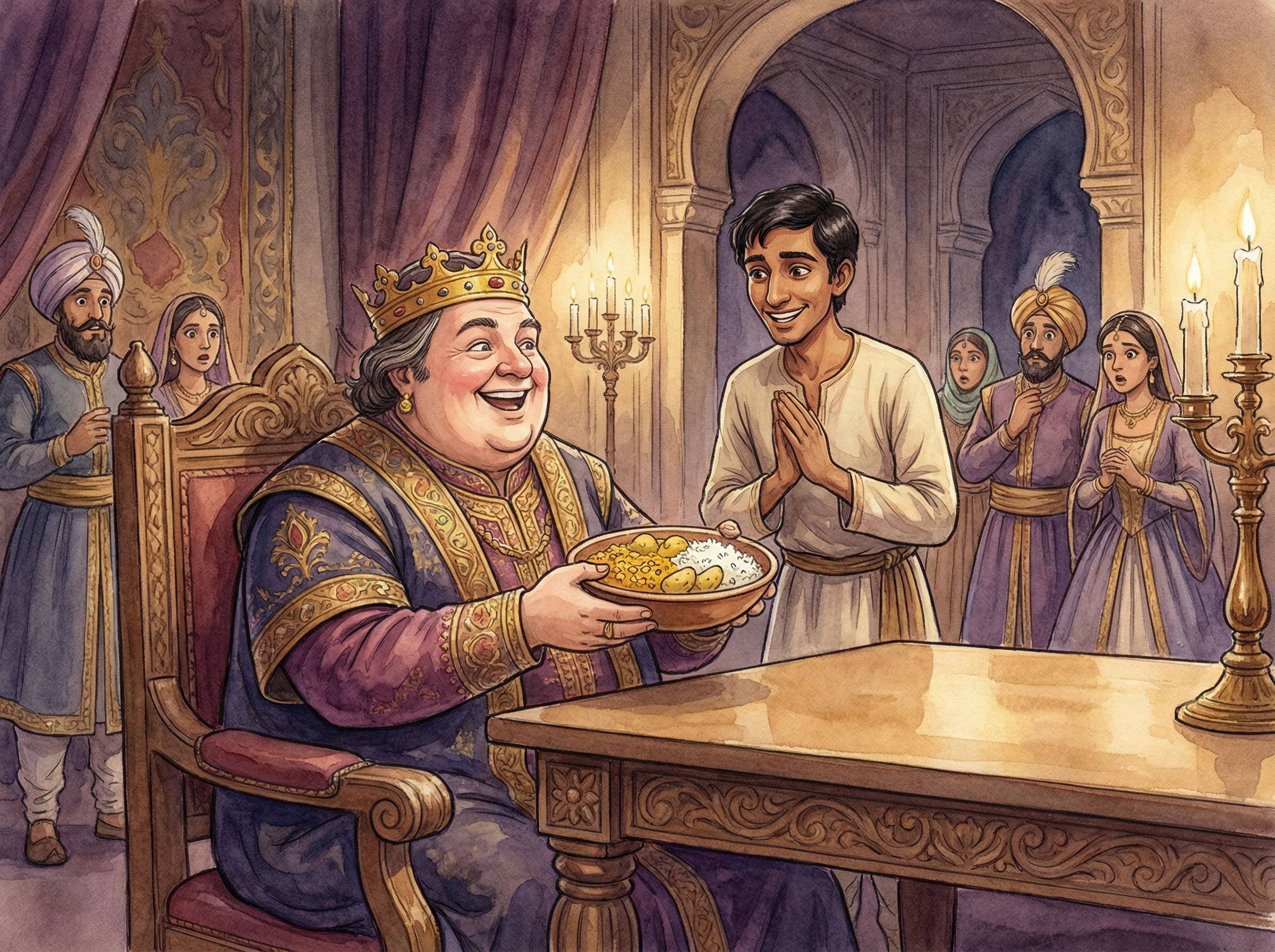 "Oh my goodness," the king said slowly. "This is the best dish I have ever eaten in my entire life. What did you do, Shankhar? This is so good. So, so good. I love you! Here are your gold coins!"