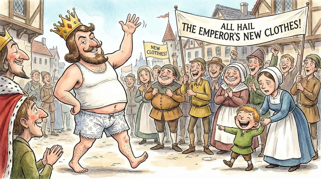 So the king said, "OK," so he called many people from his court and he said, "See my new dress, so beautiful." And these two people, the tailors who were basically cheats, kept saying, "Beautiful dress, beautiful dress." And all the people in his kingdom, in his court, all his staff said, "Beautiful dress." They also said, because nobody wanted to say you're not wearing anything. All of them could see that he was only wearing his underwear. They didn't want to tell him that you were not wearing your clothes because they thought they are the only ones who cannot see it. Because everybody else, but actually nobody. So this was, nobody wanted to say, tell him that you are not wearing clothes. And they were all concerned.