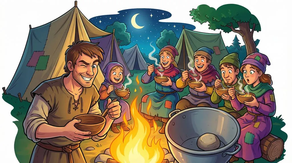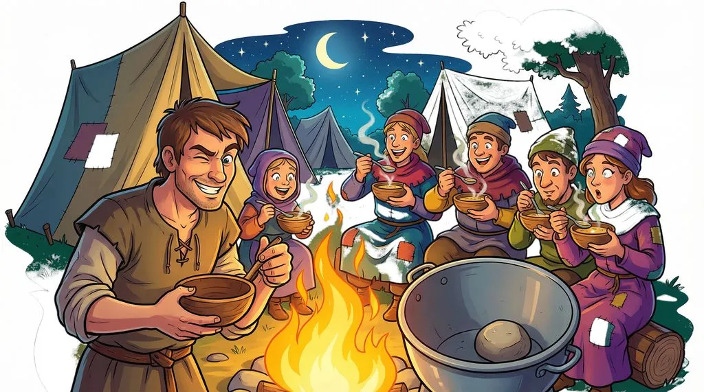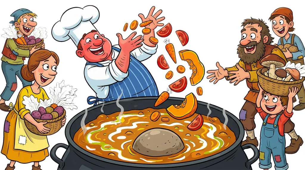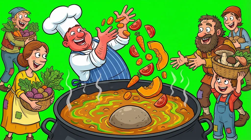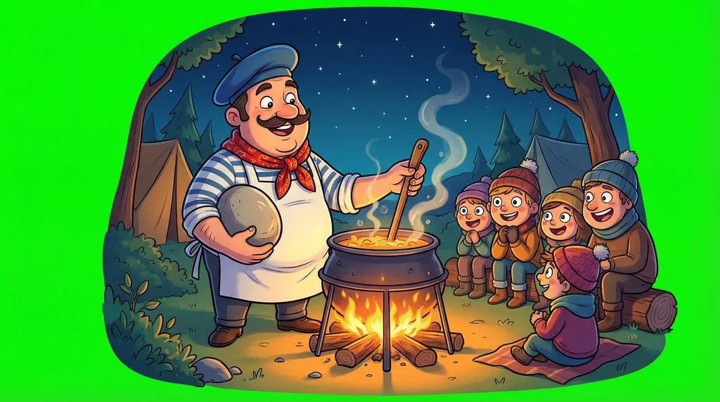 "You know what," Pierre said, "this soup can be even tastier if you give me some carrots." "Okay, sure," they said. He chopped the carrots and put them in. "Abracadabra!" he chanted, churning the water. "Look, the color is becoming red because of the rock!" (But it was really because of the carrots).
